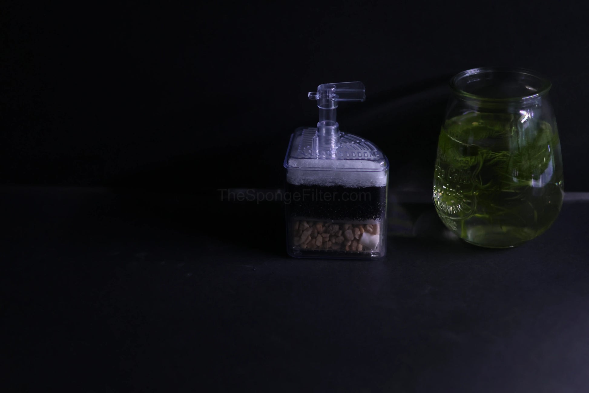 Corner-mounted sponge filter designed to save space while efficiently filtering small to mid-sized aquariums.